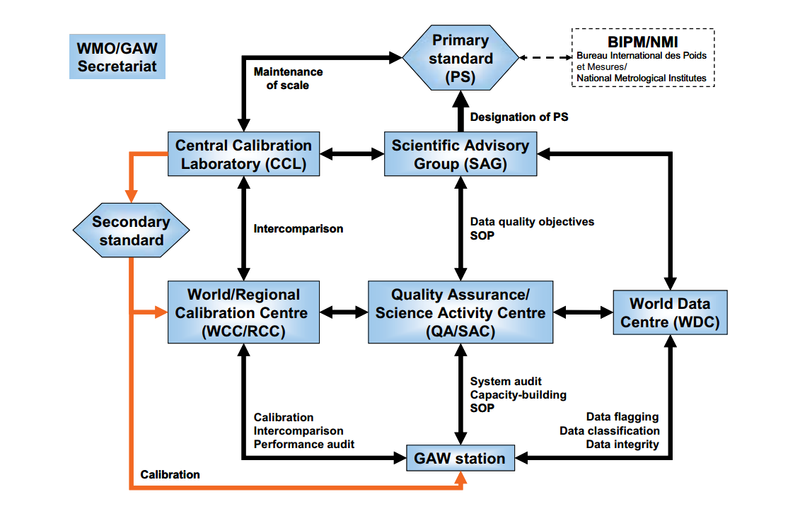 The GAW monitoring programme targets six classes of variables (i.e. ozone, UV radiation, greenhouse gases, aerosols, selected reactive gases and precipitation chemistry). Each of the six variable groups is supported by a Scientific Advisory Group and so called GAW Central Facilities (Quality Assurance/Science Activity Centres, Central Calibration Laboratories, World and Regional Calibration Centres and World Data Centres) responsible for quality control, scientific guidance and technical details of the global network.
