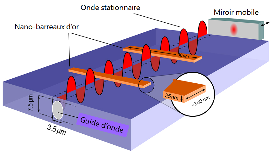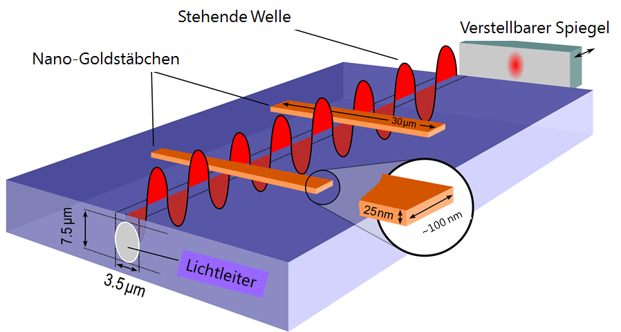 Normalerweise arbeiten Mikrochips und Sensoren mit winzig kleinen Strömen. Die gewünschten Funktionen werden durch kleinste Feldeffekt-Transistoren erzeugt, die die Ströme – je nach Funktion – umschalten, in die gewünschte Richtung lenken, filtern oder speichern. In den neuesten Bauelementen der Sensorik und Telekommunikation wird oft Licht statt Strom verwendet. Ein Beispiel ist ein neuartiges Kamera-Pixel, mit dem Licht flexibel auf seine Farbbestandteile untersucht werden kann (siehe Illustration). In ein optisches Trägermaterial ist ein Lichtleiter eingebettet, an dessen Ende sich ein im Abstand verstellbarer Spiegel befindet. Auf der Trägerplatte wurden in präzise berechneten Dimensionen Nano-Goldstäbchen abgeschieden. Je nachdem, wie diese vom Lichtstrahl getroffen werden, wird das Licht an ihnen mehr oder weniger gestreut. Das Licht tritt dabei nach oben aus. Verändert man nun den Spiegelabstand am Ende der Vorrichtung, so entstehen an den Goldbalken entsprechend variabel Überlagerungen aus zufliessendem und reflektiertem Licht, so genannte Interferenzen. Diese erzeugen an den Goldstäbchen ein für die im Lichtstrahl enthaltenen Farben charakteristisches Muster, aus dem sich zusammen mit dem Spiegelabstand die Farbbestandteile errechnen lassen. Ein Konsortium aus Forschungseinrichtungen, darunter die Empa, erarbeitet neue und zukunftsweisende Lösungen auf diesen und verwandten Gebieten.